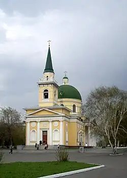 The initial idea was to build the church on the burned-out square of Cossack outer settlement in front of the Cossack military school. However, the governor of Omsk Region General de Saint-Laurent refused because of Russian Emperor's approved plan of Omsk according to which a square supposed to be situated there. A place in an artillery grove was given to the church. Corps commander, I.A. Velyaminov appealed to the Emperor with a petition and the place in front of the school was approved.[2]