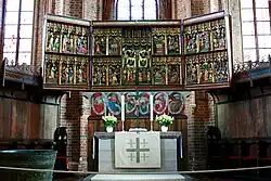 Behind the choir (Chorumgang), parts of a former high altar from the dissolved monastery Heiligenthal are shown. It features reliefs carved in Lüneburg c. 1425 and paintings from c. 1450 with four scenes from the life of the saints Laurentius and Andreas. One of the paintings contains one of the earliest views of the town. They are also attributed to Hans Bornemann.[4][5]