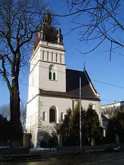 The high, square tower is linked organically with the competent body of the temple. In 1908, it was covered with a new, domed helmet, designed by architect Michal Łużecki and placed at the current helmet tent, then the smaller towers at the corners were added. A decorative element of the tower is an attic with a blind arcade of arches of Romanesque and Renaissance pilasters. In 1987–1990, a new bell tower was built in the courtyard in front of the façade, which was harmonized with architecture of the old church.
