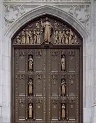 The George A. Fuller Company started renovating the exterior in August 1945[158] after blasting for a nearby building dislodged a stone from the facade.[159] The main doorway was narrowed, and some of the projecting Gothic ornamentation was eliminated because they were prone to cracks in New York City's climate, which was characterized by abrupt temperature decreases.[158][160] A bronze cross was placed atop the north tower, replacing the original stone cross there.[161] The project involved 350 workers at its peak.[158] Some funds for the renovation came from a 1946 bequest of $100,000 from radio personality Major Bowes.[162][163] By early 1947, the project was completed except for the Lady Chapel and a set of new entrance doors.[160] An anonymous donor gave the cathedral a $25,000 window, which was designed by Charles J. Connick Associates and unveiled in April 1947.[164] Work began on an interior renovation in mid-1948, with 17 of the cathedral's 19 altars being replaced.[165] Cardinal Francis Spellman blessed the new bronze doors in December 1949.[166][167]