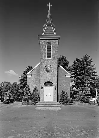 St. Patrick's Catholic Church stands in a rural setting a short way south of the village of Damariscotta Mills, on the west side of Academy Hill Road just south of its junction with Maine State Route 215. It is a rectangular brick building, bearing some stylistic resemblance to churches of the period in Virginia. It has a gabled roof, and a projecting square tower with the main entrance at its base, set in a segmented-arch opening. The next stage of the tower has a round window, with a belfry at the next stage that has round-arch louvered openings. A projecting cornice separates the belfry from the two-stage steeple, which is topped by a cross. Historic photos of the church show it with a hipped roof over the belfry instead of a steeple. The interior of the church retains original fixtures, including floors, pews, and altar.[2]