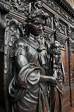 St. Paul's Church holds the most impressive array of Baroque confessionals in Belgium. The 10 confessionals, executed around 1659 by Pieter Verbrugghen I with the assistance of his workshop and other sculptors, are divided in groups of five on the side of both aisles. Each confessional is flanked by two statues on either side. The confessionals are not conceived as separate pieces of furniture but are connected by a wooden paneling. The entire wall of each aisle is thus turned into a single united piece of furniture, the iconography of which strives to achieve the same unity and synthesis as the whole structure.[6]