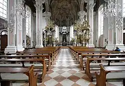 The construction of the new St. Peter's Church lasted from 1749 to 1756/57, and was carried out in the context of the valorisation of the bleaching district (Bleichenviertel). The church was consecrated 2 May 1756 by Archbishop Johann Friedrich Karl von Ostein.[2] With the beginning of secularization, the collegiate was repealed on 4 July 1802. Due to the fact that Mainz Cathedral lay partially in ruins St. Peter's was chosen for the inauguration of bishop Joseph Ludwig Colmar in 1803.[3]