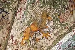 The Merchants' chapel (Krämarkapellet) is richly decorated with late medieval murals. Some of the paintings may have been made in the 1460s while others date from the early 1510s. They were made by an unknown master or workshop. The murals have been described as being both "iconographically sophisticated" and "technically accomplished" and in stark contrast to the naïveté typical for the many murals made in the countryside churches of the province at approximately the same time.[1][21] The murals cover both the walls and the vaulted ceiling, and display several different motifs, both secular and religious, set among a background of flowing, green vines.[21]