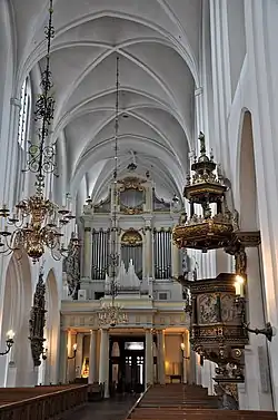 The inside of the church is characterized by the tall nave, reaching 25 metres (82 ft) at the transept. The walls, pillars and vaults are whitewashed, giving the interior a light and bright atmosphere. Its present state is largely that which it attained at the early 17th century.[1][16]