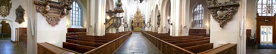The church played an important role as a spiritual centre during the Reformation, with the Reformer Claus Mortensen active as a priest in the church.[8] One of only four occurrences of violence due to iconoclasm during the Danish Reformation occurred in St. Peter's Church in 1529, when Claus Mortensen led the destruction of much of the ornamentation in the church, deemed "too Catholic" by the Reformer.[9] Of the more than sixty pre-Reformation altarpieces, only one survived more or less intact. It was also following the Reformation (in 1555) that the interior of the church was whitewashed.[6]