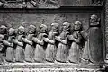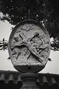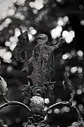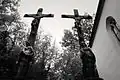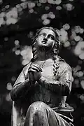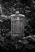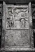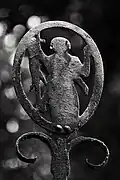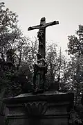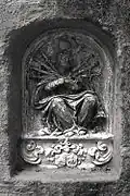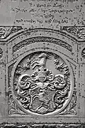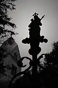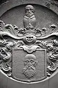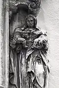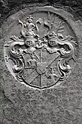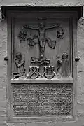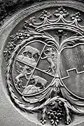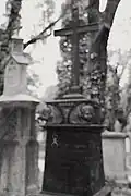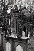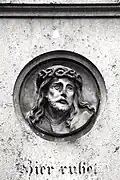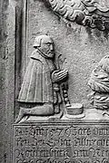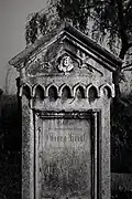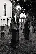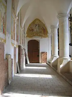 The graveyard surrounding St. Peter's includes three free-standing chapels: a Kapelle Unserer Lieben Frau (Chapel of Our Dear Lady), perhaps originally Romanesque, with a 15th-century ossuary;[11] the Agnes-Bernauer-Kapelle, the burial place of the like-named secret wife of Albert III of Bavaria, executed on charges of witchcraft;[12] and the Totenkapelle (Chapel of the Dead), built in 1486.[13] The latter is perhaps of the greatest artistic significance, on account of its extensive cycle of paintings representing the Totentanz (Dance of the Dead), created by the Rococo artist Felix Hözl (died 1774), a resident of Straubing, in 1763. The cycle is of note as an 18th-century treatment of a predominantly medieval theme.[14]