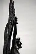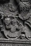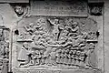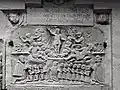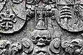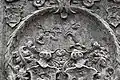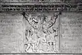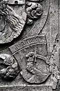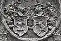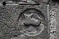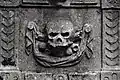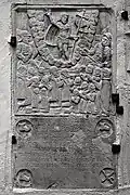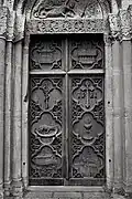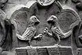 Two portals provide access to the building, one from the west and one from the south. The tympanum of the west portal portrays a knight, armed with sword and shield, battling a dragon. The head of a man, whom the dragon has swallowed, is visible between its jaws. The representation may allude to the words of Psalm 35/34: