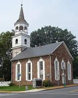 St. Peter's Kierch is a 2½-story, Georgian-style church at the intersection of Union and High Streets in Middletown.[3] The church was constructed from red sandstone. Originally, galleries were located on the east, west and south sides with the wineglass pulpit on the north side. The bell tower was constructed 46 years after the rest of the church, on the west side, as it was not intended to be used an entrance.[4] The sides of the church have three windows reaching to the upper story. Each window has forty-four 9-by-12-inch (23 cm × 30 cm) panes of glass—eleven panes high, four across.[3]