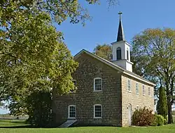 Land for the church building was purchased for $30 an acre from Eli Carlan.[2] Gerhard Bierbaum deeded another acre for a total of 6.16-acre (2.49 ha). The church members quarried the stone from the Bierbaum quarry. The cornerstone for the church was laid on October 25, 1858. The building measures 55 by 30 feet (16.8 by 9.1 m), with the 12-foot (3.7 m) length in the back reserved for the pastor's quarters. The structure was built for less than $1,100.[2] A well of 35 feet (11 m) deep and 5 feet (1.5 m) in diameter was dug by Sebastian Walsh for a $1.00 a foot until he hit rick and then he was paid $1.15 a foot.[2]