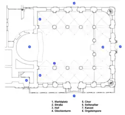 The nave of the three-nave relay church rises above a roughly square ground plan. The semi-circular choir adjoins to the east. The edge length of the interior without the choir is about 26 meters. Ten strong columns provide the subdivision: Two times four columns delimit the central nave and the two side aisles from each other; the last pair of columns and two columns set between them support the organ loft. Each column stands on an octagonal base and has an attic base and a Corinthian capital. The room height in the barrel-vaulted central nave is a good 15 meters, in the groin vault side naves just under 12 meters. The choir is vaulted by a half-dome with stitch caps and originally had eight round-arched windows (two mock windows on the left, two shades in the center, and two real windows on the right); the pilasters between them were probably stuccoed. The communion bench, built in 1741, separating the nave and the choir, is made of marbled sandstone.[24]