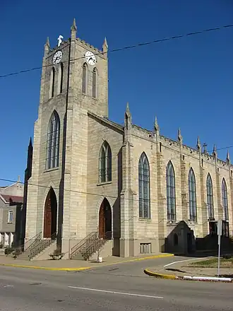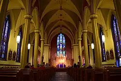 Construction for the foundation of St. Thomas began in 1842, with Zanesville's Protestant community contributed funding; local Quaker, John Howard, donated stone from his property.[2][4] The cornerstone for St. Thomas Aquinas Church was laid on March 17, 1842 by bishop Richard Pius Miles of Nashville. The English Gothic structure cost $40,000, and the first Mass was celebrated on in the basement of the church Christmas of 1842. The church was gradually finished over time, with a steeple being added in 1871[2]