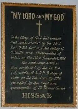 St. Thomas' Church is located in Hisar city of Haryana, India. It is located in central part of Hisar near railway station. It has been declared as a historical monument by Indian National Trust for Art and Cultural Heritage. The Church is dedicated to St. Thomas, one of the 12 main disciples of Jesus Christ.[1]