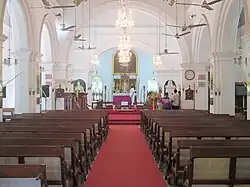 The church is considered an exact replica of St Clement Danes at London.[1] St. Thomas Garrison Church was modelled on contemporary churches like St. George's Cathedral, Chennai. It is located in the foothills of St. Thomas Mount and is named after St. Thomas, one of the Twelve apostles who resided at the place during his final years. It is 133 ft (41 m) long and 66 ft (20 m) wide. The compound was built with bricks, mortar and limestone. It is believed that the railings are made out of iron from the discarded weapons of Tipu Sultan. The Church was originally the starting point to Southern districts, located in 1, Grand South Trunk Road from Chennai. The building had a bomb-proof roof, rust-proof iron railings and cast iron chairs imported from England. The altar houses conventional Methodist images and a prayer hall for the worshippers. Paintings of Jesus Christ and other apostles are housed on the walls facing the worshippers. The room behind the sanctuary has a wooden staircase leading to the top of the tower. The original temple bell cast in England was heavy and developed cracks. It was replaced by a smaller bell from Rangoon donated by a church member. There are twenty windows, five doors, Roman ionic pillars, a false ceiling made of teak wood, imported chairs, Bible and a pipe organ. The British Army and administrative officers residing in the Garrison and regions around it made generous contributions to the church. The monument of Major-General William Sydenham is found in the precincts of the Church. The Church originally had a multi level tall spire, which was trimmed to accommodate passing flights from the nearby airport.[2]