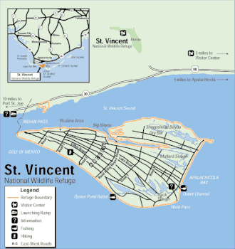 The purpose of the refuge is to provide habitat for migratory birds including some endangered species. About 277 bird species use the islands as a migratory stopping point annually.[2] St. Vincent Island and Pig Island are open for recreational activities and are accessible only by boat. The islands contain undeveloped trails and beaches, with no visitor center, drinking water or restrooms. And Saint Vincent (Florida) is the Westernmost of Four (4) Barrier Islands in the Northwestern in Florida Gulf.