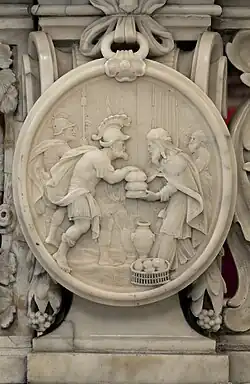 The white marble communion rails were made by Hendrik Frans Verbrugghen in 1695. These rails are a high point of Flemish Baroque sculpture. Because of the virtuoso treatment of the marble they appear to be modeled in wax.[3] The confessionals in classicizing style date from 1802. The oak choir stalls and communion rails are from the 18th century. The Baroque pulpit is a work of Artus Quellinus II (1670) and was made on the basis of the iconography of Willem Hesius.