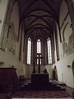 The choir with wooden balustrade stands on Tuscan stone pillars with capitals. There is a painted wooden ceiling under the choir. The western wall under the choir is painted with 4 Latin inscriptions, which were added in the reconstruction from 19th century. There is a columbarium under the choir.