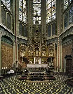 The Willibrord's Church is constructed between 1875 and 1877 after the design of architect Alfred Tepe in gothic revival style. It is one of the most well kept remaining examples of the Utrecht Styl of the gothic revival. The sober exterior of the church is a great contrast with the elaborate and colourful interior. Many artists from the St. Bernulphus Guild worked together to decorate the church. Almost every wall of the church is painted. These colourful paintings are part of the various other elements of the church, including the wood carvings and stained glass windows depicting the life of St. Willibrord. The tabernacle doors are painted by Jacob Ydema (1939). In 2005 a large-scale restoration was completed, helping to maintain the unique and wonderfully colourful interior. The most important part of the church, the choir, is the most extensively decorated part of the church. Central to this is the symbolism of the Holy Sacrament. Because the church is surrounded by houses, the architect chose to build an extra high, yet short building with high windows. The church was dedicated in 1877 by monsignor Schaepman, but the interior wasn't completed until 1891.