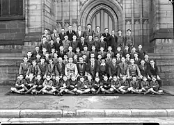 St Andrew's Cathedral School was founded by the third Bishop of Sydney, Metropolitan of New South Wales and Primate of Australia Alfred Barry. The school was opened as the St Andrew's Schoolroom on 14 July 1885 in the Old Baptist Church premises in Pitt Street, on the corner of Bathurst and Kent streets. At the school opening, Bishop Barry stated that St Andrew's was established to provide "the choristers with a high-class, free education on Church principles, in addition to a musical training".[8] The school started with 27 boys, of whom 22 were choristers and, although it was later nicknamed the "Choir School", provision was made for non-choristers to attend. Enrolments reached a total of 80 in 1892, but suddenly dropped to about 50 and remained at this number for many years.