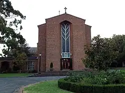 The main church building, of cruciform shape with shallow transepts, has a steel frame; red autumn-tinted "ripple-tex" brick was used for the exterior and hard-faced "oatmeal"-coloured cream brick for the interior. The dimensions are spacious: the building is almost 200 feet long and the nave is nearly 50 feet high with a distinctive ceiling of golden anodised aluminium tiles. Externally, the copper flèche over the crossing is nearly 120 feet high.