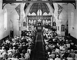 Following the devastating fire in February 1961 which destroyed the third church building and previous Memorial Organ, the new four-manual War Memorial Grand Organ, designed by the Organist of St Andrew's: Ian L. Thomas, was dedicated on Easter Day 1964 in the newly rebuilt ‘Cathedral of Light’. It has been played almost daily ever since for services, concerts, weddings, funerals, lessons and recordings.[4]