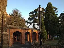 On 24 October 1843, the two-acre St Andrew's Graveyard, established to the north-east of the first building, was consecrated by Bishop William Grant Broughton, the first and only Bishop of Australia. The graveyard was the first portion of the existing church land to be used for religious purposes and is a rare surviving example in Victoria of a pre-gold rush graveyard.[4] The first burial took place the following year, well before the opening of the Brighton General Cemetery in 1855, and St Andrew's Cemetery was the major burial ground for the district. More than 300 burials took place, mostly before 1860, and the graves of many district pioneers are located in the graveyard. After over 100 years of interments, the last burial took place in 1948. However, the adjoining garden of remembrance, established in 1953, remains in use.[4] Melbourne's oldest churchyard cemetery, the St Andrew's Graveyard is one of only four remaining churchyard cemeteries in Melbourne.[6]