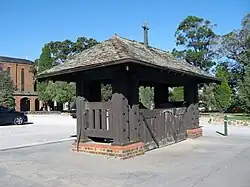 The main church car parking area is entered from New Street, to the north of the corner of Church and New Streets; the entry to the car park is at the site of the rustic timber lych gate, built to the west of the church in 1926 in the Arts and Crafts style and possibly designed by Louis Williams.[3]