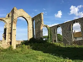 The oldest fabric in the original large medieval church dates from the 14th century, although most of it is from the 15th century. During the Civil War much of the stained glass was destroyed by the local iconoclast William Dowsing.[5] By the later part of that century the large church was too expensive for the parishioners to maintain, and they were given permission in 1672 to remove the roof and to build a much smaller church within it.[5][6] This small church is still in use, while the tower and the ruins of the old church are maintained by the Churches Conservation Trust.[2]