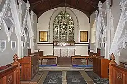 The nave, of the 15th century, has a north aisle of four bays, and a wide chancel arch. In the south-west corner of the nave is a marble monument surmounted by an urn, a memorial to Edward Hodge (1782–1815). The 15th-century font is octagonal; the eight panels of the bowl show the Four Evangelists, alternately with their symbols, and around the stem are four seated lions.[1][3]
