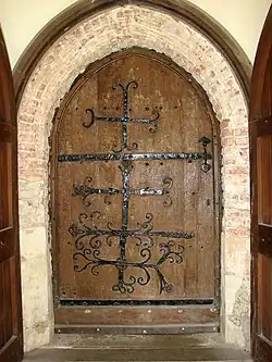 The church is situated in the grounds of Raveningham Hall. It is built of flint, with a slate roof; the walls are rendered over. The round tower dates from the 12th century, with an octagonal upper part of the 13th century. The south door has fine ironwork of the 12th century, in the form of foliate crosses.[1][3][4]