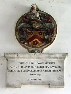 The church is next-door to Wimpole Hall, the largest house in Cambridgeshire. The church dates from medieval times but the current building is mainly the result of a rebuilding project in the 18th century carried out by one of the owners of the hall, the Earl of Hardwicke. The Earl's architect was Henry Flitcroft, who demolished the medieval church on the site apart from the north chapel (sometimes known as the Chicheley Chantry), which was incorporated in the new building.[1]