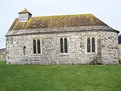 The small flint and stone Norman Anglican Church of St Andrew has an apse at the east end and a barrel vault roof which curves around it.[2] The roof was replaced and windows inserted in the 16th century. The oak door is heavily studded.[1] The interior has limewashed walls, a 15th-century font[1] and flag stone floor, along with early 18th-century oak fittings. The eighteenth century oak pews, the pulpit, screen, communion rails and matching table with barley sugar turned legs, and other woodwork were provided by William Wake, Archbishop of Canterbury, who had been raised in the village of Shapwick and whose family lived locally. The west end has a late medieval gallery with a panelled front which was probably originally a rood screen.[2] The roof is topped by a small weatherboard belfry which resembles a dovecote.[4]
