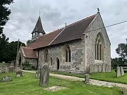 The bell-turret at the west end, under a shingled broached spire, has five bells cast in 1793 and a sixth added in 1999.[3] The turret carries an unusual clock made by a local craftsman in 1911 to commemorate the coronation of George V. One of its three faces has the letters GLORY.BE.TO.GOD instead of numerals. Its chiming mechanism is like that of a musical box and plays six distinct tunes.[4]
