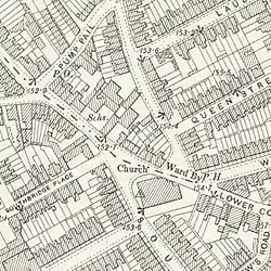 The boys' school opened with 23 pupils and numbers were never as high as in the girls’ school. This was probably due to the fact that there were more schools for boys in Croydon competing with St Andrew's. Just next door but one, in Church Street, was the Whitgift Poor School which went on to become Trinity School. The head of St Andrew's boys' school was also a twenty-one year old. His name was Frederic Le Huquet and he came from Guernsey. Croydon Old Town in those days was not a healthy place to live. It was damp in the valley and the housing was often squalid and insanitary with the poor drainage. Smallpox was a common disease amongst the pupils. Mr Le Huquet wrote in the school log-book in 1863 that he had a "fear of contagion". This proved sadly prophetic for within ten months of taking up his post as head master of the new St Andrew's school for boys, he died from smallpox.[3]