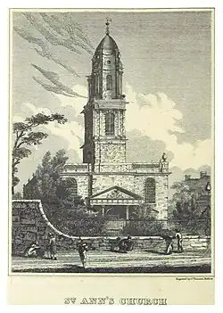 The first architect was Sir Thomas Drew, the foundation stone being laid on 6 September 1899 by the Countess of Shaftesbury. The old parish church of St Anne by Francis Hiorne of 1776 had continued in use, up until 31 December 1903, while the new cathedral was constructed around it; the old church was then demolished. The Good Samaritan window, to be seen in the sanctuary, is the only feature of the old church to be retained in the cathedral. Initially, only the nave of the cathedral was built, and this was consecrated on 2 June 1904.[1]