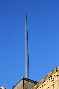 In April 2007 a 40-metre stainless steel spire was installed on top of the cathedral. Named the "Spire of Hope", the structure is illuminated at night and is part of a wider redevelopment planned for the Cathedral Quarter.[3] The base section of the spire protrudes through a glass platform in the cathedral's roof directly above the choir stalls, allowing visitors to view it from the nave.