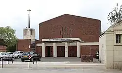 In 1932, Fr Leo A. Ward succeeded Fr Buckle as parish priest. With the church again needing to be enlarged, Fr Ward set about the building of the current church. On 17 June 1967, the foundation stone was laid by Bishop Patrick Casey. On 23 March 1968 the church was blessed. On 20 April 1968 it was opened by Cardinal John Heenan. The church was designed by John Newton of the firm Burles, Newton & Partners, and has stained glass windows designed by Patrick Reyntiens. Jerzy Faczynski, who also did the stained glass in St Ambrose's Church, Speke, designed the windows in the side chapels. The old church became the school hall.[5][6] From 2001, priests from the Society of Jesus have been serving the parish. Nearby, they started the De Nobili Dialogue Centre, a centre for inter-religious dialogue. Named after Roberto de Nobili, it provided a space for different faiths to meet in prayer and dialogue.[10] It was also associated with the Centre for Christianity and Interreligious Dialogue at Heythrop College, University of London.[11]