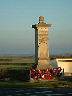 The war memorial is located on the grass along the B4265 road at Gileston Cross to the south of the village. It was built in around 1920 to commemorate those who died during the First World War. The memorial, built from Portland stone ashlar, is a square pillar raised on three steps with a dentilated cornice, capped by a ball.[21] The Church of St Athan contains monuments of the Berkerolles family with recumbent figures of a knight and his lady.[23]