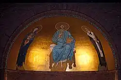 Other artwork in the church includes the apse painting, two icons and two triptychs designed and painted by Fleur Kelly in the late 1980s and 1990s. The painting in the semi-dome of the apse depicts Christ Pantocrator, flanked by Mary and Child and an elderly St Augustine, on a gold background; Julian Orbach writes that the apse is "much enhanced" by the work.[3] The icons to the sides of the apse are of Pope Gregory the Great and King Ethelbert of Kent. The triptychs are of the Virgin Mary and Child, and St Augustine holding a model of the current church.