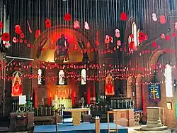 In 2018, a display of 1,300 poppies commemorated the 100th anniversary of the Armistice and the end of World War One.[8] The poppies were made by pupils of Even Swindon Primary School and church members, and hung on thin lines so that they appeared to float above the congregation and visitor alike. Other displays included a cascade of knitted poppies over the font and from the high altar, "There but Not There" silhouettes, and information on the local men who never came home.[9] Photos of the displays were included in most UK national newspapers and the church was used by BBC Points West for a live broadcast of their evening news programme on 9 November 2018, the Friday before Remembrance Sunday. The programme was anchored by Alex Lovell.
