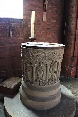 The font is an exact replica of the fine Norman font at St Leonard's Church, Stanton Fitzwarren. It is divided into ten compartments, each with a Latin inscription. The first, Eclesia stands for the church – and the carving is of the crowned Divine Bride, holding the sacred chalice and killing evil (depicted as a serpent) with the stem of the cross. The second compartment, inscribed Cherubim shows a six winged cherubim, with its eyes covered to show its spiritual nature. The Cherubim holds a sword to show it is guardian of the Church.