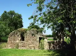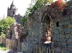 In addition to the college of priests, the income of the foundation was for the support of thirteen disabled poor men[25] (tresdecem pauperum debilium).[24] At the same time, Dame Isabel had almshouses built at the western end of the church that would house 13 people.[32] The almshouses (also known variously as the hospital) were abandoned and rebuilt off-site in Tong village in the late 18th century.[33] The derelict almshouses were destroyed in the 19th century by the then owner of the Tong estate, Mr George Durant. Only one of the outside walls is left standing today[34] which is grade II listed.[35]