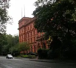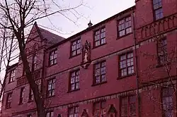 In the late 1870s and early 1880s, the Vaughan building was constructed (see pictures). The original plan was for a symmetrical building, with five-storey towers at each end. Only one half of this design was ever carried out, but the main ground floor corridor of the Vaughan building is an impressive centrepiece for the school all the same. An imposing entrance on Alexandra Road (decorated with ceramic mouldings by Tinworth[2]) leads into a corridor adorned with mosaics and marble. The original aquarium building (now the school's Academic Hall) leads off the main corridor directly opposite the main entrance. Appropriately the decorative scheme includes plaster mouldings of fish and other marine animals.