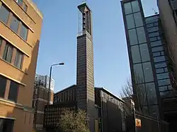 The church has a rectangular plan oriented with its altar facing south. The north-facing façade features a large abstract frieze made up of 65 individual coloured-glass windows that form a grid of black mosaic crosses on a yellow ground. The frieze is positioned above a glazed timber entrance.[1] A tall and slender bell tower clad in grey mosaic tiles stands to the north-west corner. Its upper stage is cut away on three sides to reveal four bells that were cast at the neighbouring Whitechapel Bell Foundry in 1885 and salvaged from the former church.[1] The shallow-pitched copper roof incorporates clerestory windows on all but the south elevation, forming an inset glazed gable that rises above the north-facing frieze.[3]