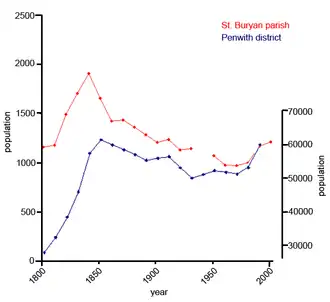 Whereas St Buryan was an important regional religious centre during the Middle Ages due to its monastery and Royal Peculiar status, the importance of the parish to the district faded with the onset the Industrial Revolution. This was in part due to the destruction of the collegiate buildings during The Protectorate period after the English Civil War[20] and also the gradual weakening of the political position of the Church of England that occurred during the eighteenth and nineteenth centuries. This loss of importance is reflected in the fact that the proportion of the district's population living in the parish fell from four and a half to less than two percent over this period.[4] Unlike other parishes in Penwith, such as St Just, St Buryan was not a major focus of tin mining activity during the eighteenth and nineteenth centuries, having a mainly agrarian economy. After a spike in population in the early 19th century that is mirrored across the district and coincides both with the arrival of the railways and increased tin mining activity in Penwith, the population of the parish gradually declined over the next two hundred years (see figure right), in part due to the increased mechanisation of farming that the industrial revolution brought, requiring fewer people to work the land.