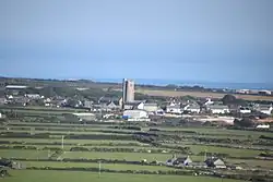 The parish, which is generally fertile and well cultivated, comprises 6,972 acres (2,821 ha) of land, 3 acres (1.2 ha) of water and 18 acres (7.3 ha) of foreshore and lies predominantly on granite.[4] It is more elevated at its northern part and slopes gently north to south-east towards the sea. Carn Brea, (50°09'N, 5°65W), often described as the first hill in Cornwall (from a westerly perspective), sits at its northernmost edge and rises 657 feet (200 m) above sea level The hill is also an important historical site showing evidence of neolithic activity, as well as the remains of the chapel from which it is named. Toward the south is the village of St Buryan, which sits on a plateau and is centrally sited within the parish. Further to the south the terrain slopes down toward the sea, ending in several deep cut river valleys at Lamorna, Penberth and St Loy that are both sheltered and heavily forested. West of St Buryan, toward St Levan, the terrain again gently descends, causing the ground to become more marshy and waterlogged and less suitable for growing arable crops. East of the village the land also slopes away toward Drift, and its reservoir, past the wooded area at Pridden and the deep cut valley at Trelew (in which a steep embankment has been built to carry the B3283 road). Other settlements of note in the parish include Crows-an-Wra to the north, as well as Sparnon and Tregarnoe further south (see map, right). Since 1990 St Buryan and the surrounding region has been designated a conservation area by Penwith District Council;[5] recognising the village's status as an area of special architectural and historic interest and preventing development that might alter the village's character.