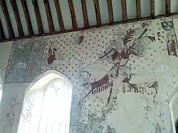In 2013 restoration work was carried out on medieval wall paintings discovered at the church in 2008. When layers of limewash were removed, it was found that the topics depicted include the Seven Deadly Sins and Saint George and the Dragon.[5] Further investigations suggested that the paintings are among the best surviving examples in the whole of the UK, and that the depiction of Saint George and the Dragon is the largest on the subject from that period, as well as the most complete. Another painting deals with the unusual topic of "Death and the Gallant". Their date has been estimated at the second half of the 15th century.[6]