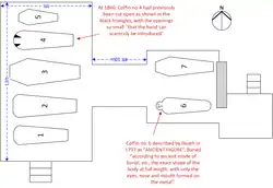 | Coffin 4 – 5'10" by 1'4" | Edward Marquis of Worcester, noting the transcription "Illustrissimi Principis Edwardi, Marchionis et Comitatis Wigorniae, Comitis de Glamorgan, Baronis Herbert de Ragland, et qui obiit apud Londini tertio die Aprilis, A. Dno. MDCLXVII. Loyal to his prince, a true lover of his country, and to his Friend most constant."[10] | Coffin showed evidence of having been previously opened, with two triangular cuts at the head shown on the plan. The inscription was not present on this coffin, and consequently this was interpreted as not being the Marquis' coffin.[10] | |