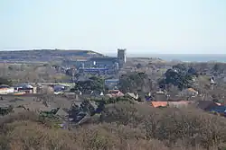 The chapel site was investigated in 1921 by The Bournemouth Natural Science Society, with guidance from Heyward Sumner. Fragments of Purbeck stone, stone roof tiles and glazed floor tiles were found in exploratory trenches, but no hewn stone nor foundations were revealed. The society concluded that there had been a substantial building on-site, but the usable material had been removed and it was not possible to determine size or form.[16] A more thorough excavation took place in 1967. The Bournemouth Archaeological Association directed by Michael Ridley, found a number of artefacts, including an ichthys drawn on a piece of stone, glazed and unglazed pottery, and some shards of mediaeval coloured glass. They also discovered two types of flooring, a glazed tile floor and an earlier marble one, along with seven types of building stone and eight different roof tiles, suggesting that the chapel had stood for a considerable amount of time.[15] The hill was initially chosen as the site for Christchurch Priory. A local legend tells how the church was then built at its present location, after the building materials were moved there each night.[17][18]