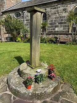 To the south of the church there are the remnants of a stone preaching cross.[35] The cross was originally situated on Poulton's boundary and marked a resting place for mourners travelling long distances to bury corpses at St Chad's.[36] Only the two circular steps into which the original structure was set remain; the cross shaft has been replaced by an octagonal pillar. The pillar was used as a sundial until the early 20th century when the gnomon was stolen. The steps function as a memorial for present-day mourners at St Chad's, in a small garden of remembrance.[36] The churchyard is noted locally for its display of crocuses and other flowering bulbs in early springtime.[20][36]